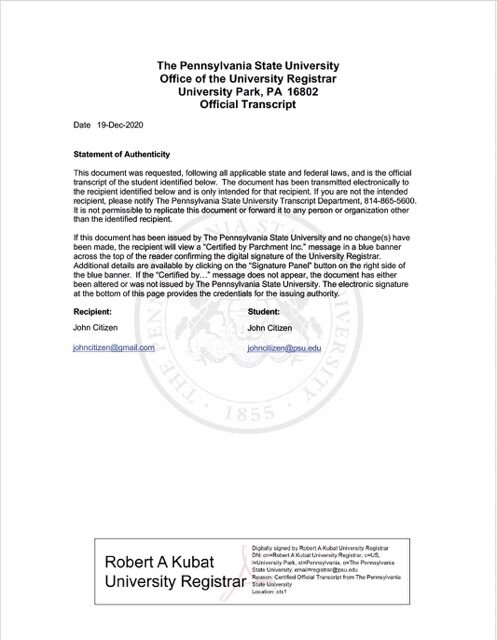 The Pennsylvania State University official transcript Word and PDF template, 2 pages